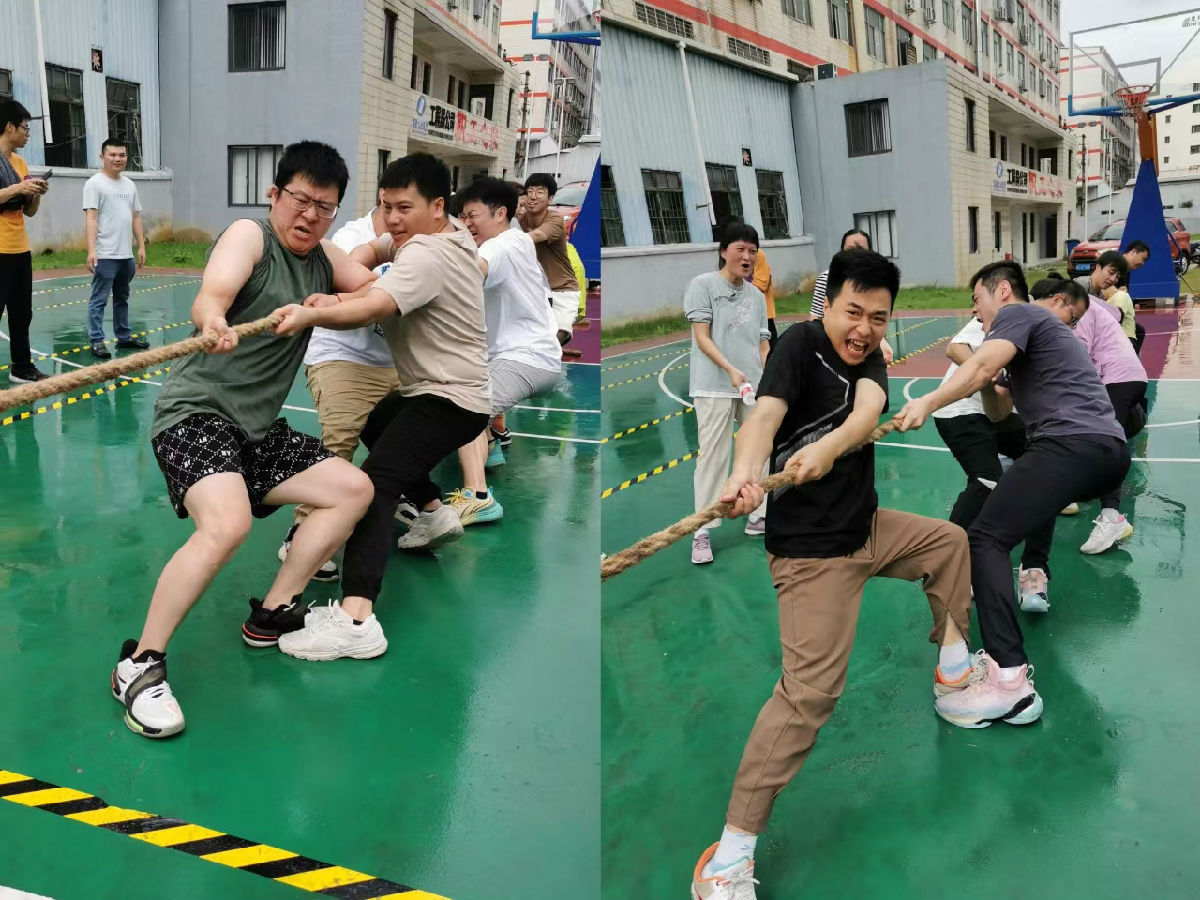 力量角逐,上下一心。伴随着裁判的一声哨响,两个队同时发力,拔河绳陡然绷紧,队员们步调一致、扎稳马步、降低重心、身体后倾,纷纷咬紧牙关,奋力拼搏,“一根绳、一条心”的团结意识体现的淋漓尽致。