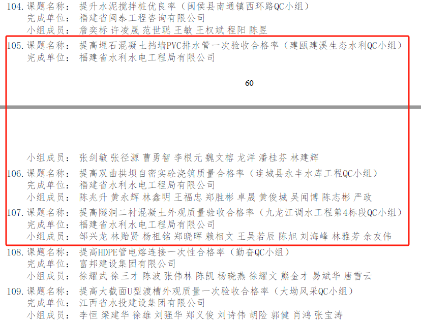 日前,工程局公司选送的8项QC小组成果全部通过中国水利工程协会评审,获评2024年度水利工程优秀质量管理小组成果。其中,《提高土料碾压筑堤一次验收合格率》获得Ⅰ类成果,《降低自来水厂混凝土池壁渗漏率》《提高高大模板安装支撑体系一次合格率》《提高双曲拱坝坝面测量精度》《提高隧洞光面爆破效果》获得Ⅱ类成果,《提高埋石混凝土挡墙PVC排水管一次验收合格率》《提高双曲拱坝自密实砼浇筑质量合格率》《提高隧洞二衬混凝土外观质量验收合格率》获得Ⅲ类成果,集中展示了工程局公司在建工程质量改进与创新发展水平。