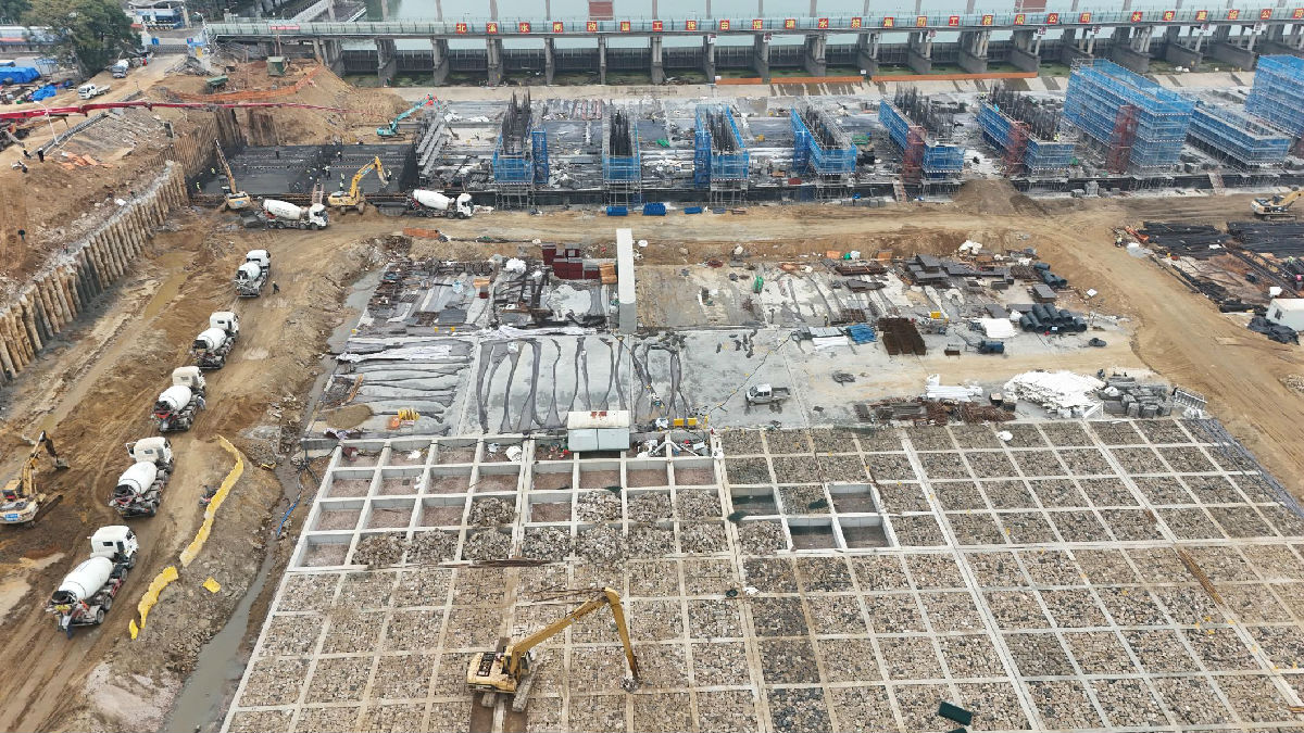 2024年12月25日,北港水闸完成首块闸室底板浇筑,正式拉开了北港水下主体结构施工序幕。为确保今年汛前如期完成北港水下部分作业,春节期间,百余名建筑工人及现场管理人员坚守岗位就地过年,加班加点抢抓进度。截至目前,累计完成混凝土浇筑7万立方米。下一步,参建各方将协同推进闸墩及消力池等建设,确保汛前完成水下主体部分施工。
