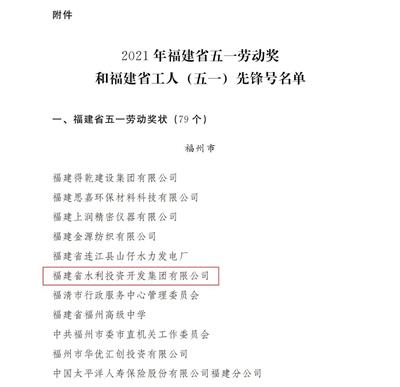 近日,省总工会通报表彰了2021年福建省五一劳动奖和福建省工人 (五一) 先锋号,福建省水利投资开发集团有限公司荣获福建省五一劳动奖状。