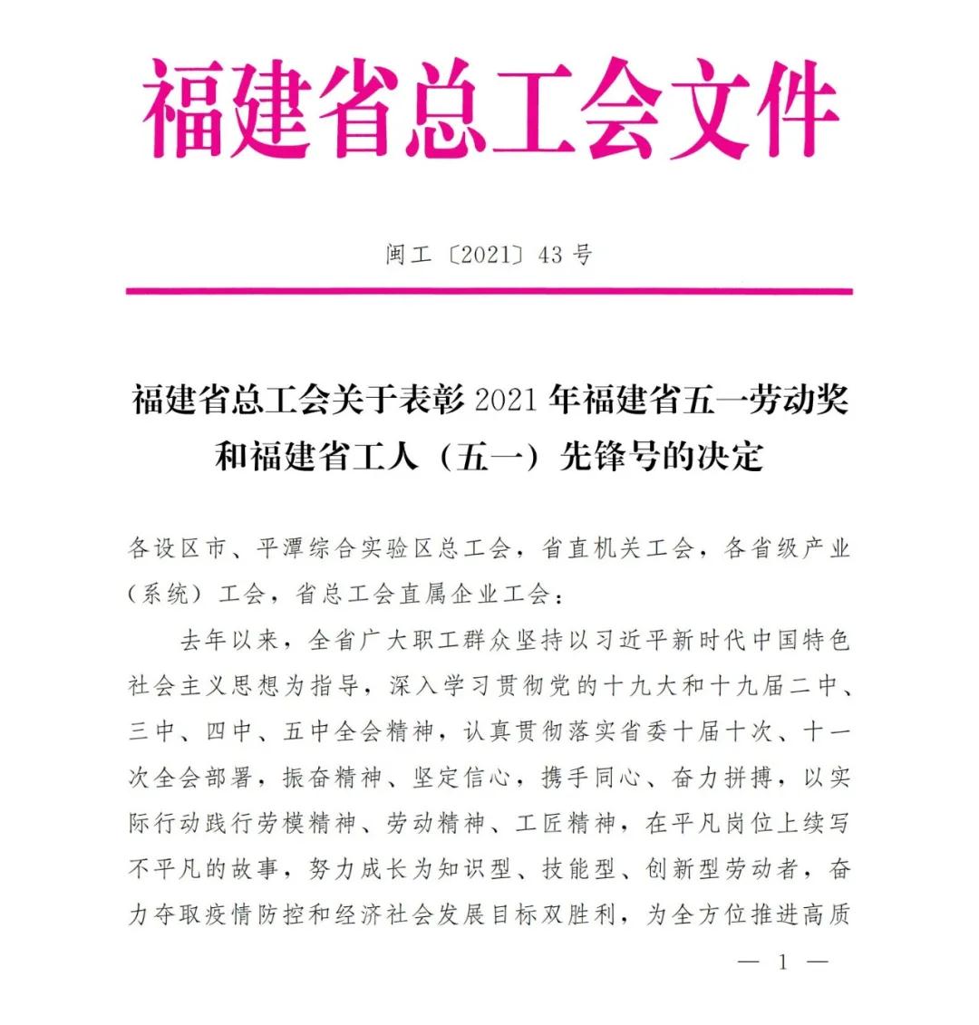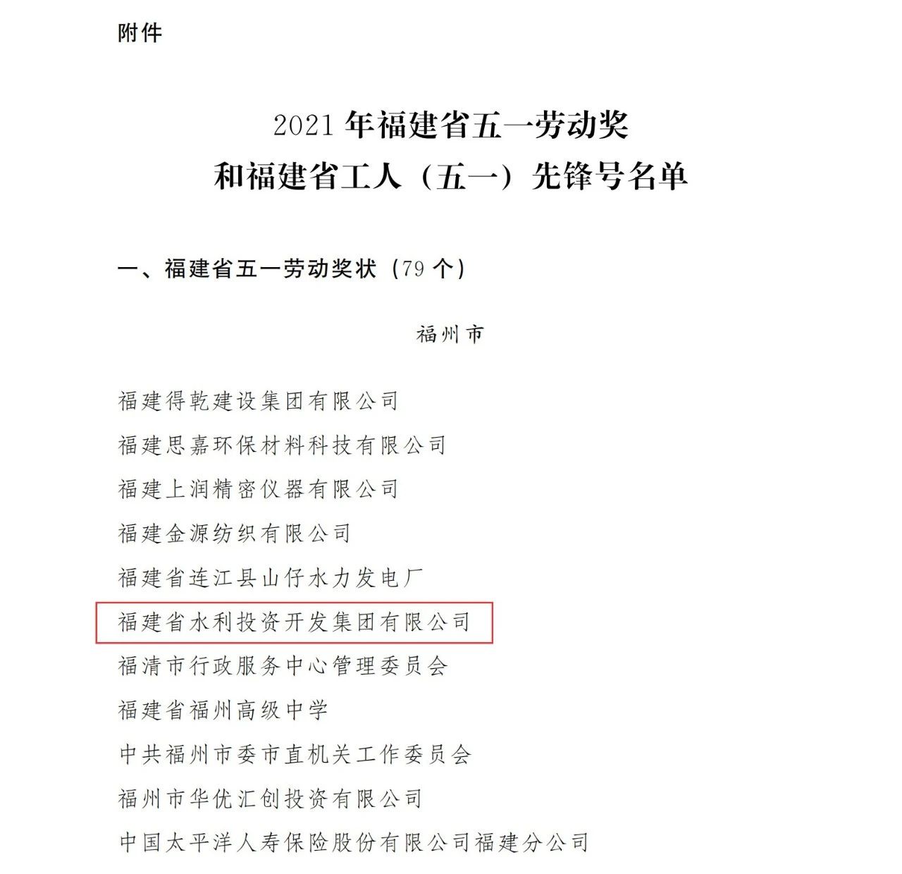 近日,省总工会通报表彰了2021年福建省五一劳动奖和福建省工人 (五一) 先锋号,福建省水利投资开发集团有限公司荣获福建省五一劳动奖状。
