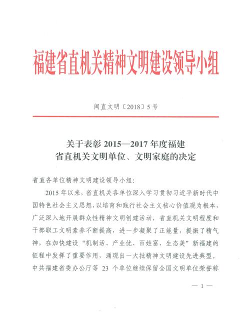 ??近日,福建省直机关精神文明建设领导小组下发表彰通知,集团被评为“第十三届(2015-2017年度)福建省直机关文明单位”称号。??