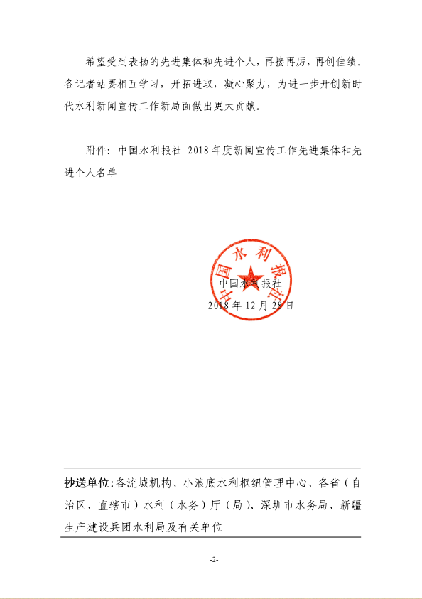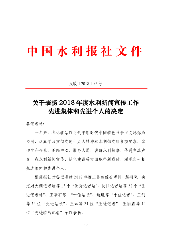 近日,中国水利报社通报表扬2018年度水利新闻宣传工作先进集体和先进个人,我省水利新闻宣传工作获多项荣誉,91大神 一名新闻信息宣传负责同志被评为“先进特约记者”。