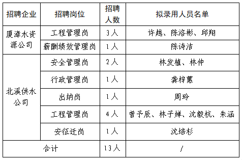 根据厦漳水资源公司、北溪供水公司2025年招聘公告,经过报名、资格审查、笔试、面试等公开招聘程序,现将13位拟录用人员进行公示。公示时间从2025年4月16日开始,公示期为五个工作日。在此期间内,如有意见可通过来电、来信、来访的形式反映情况。